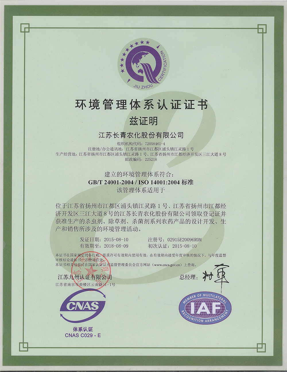 环境管理体系认证证书