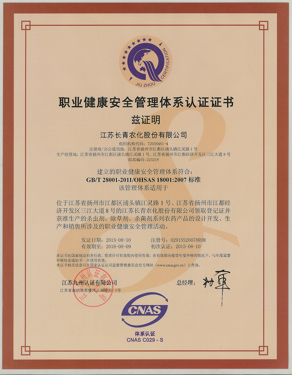 职业健康安全管理体系认证证书