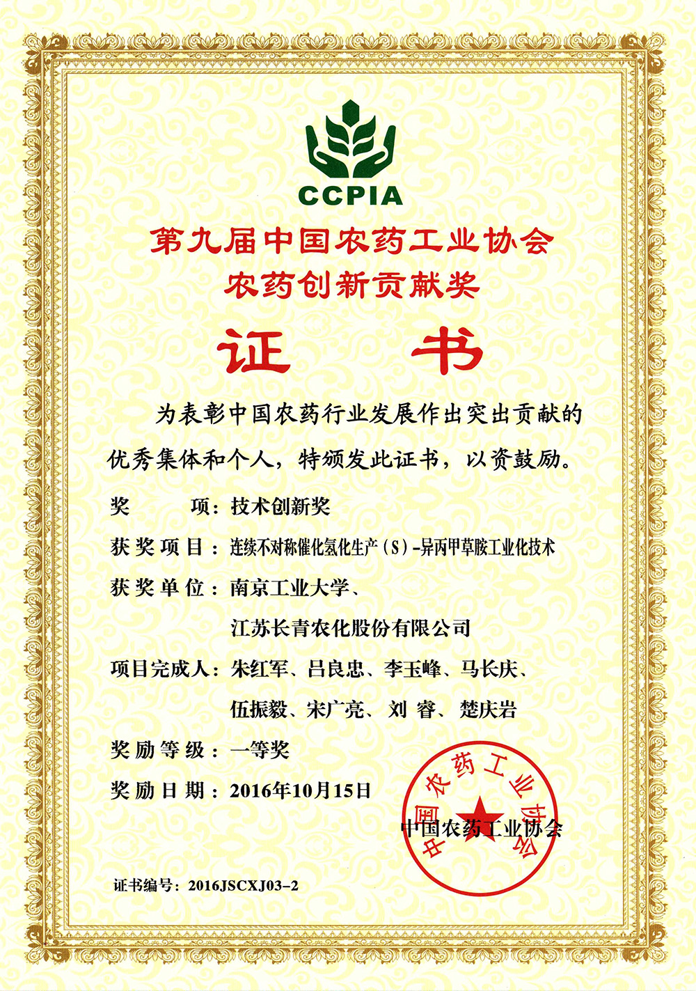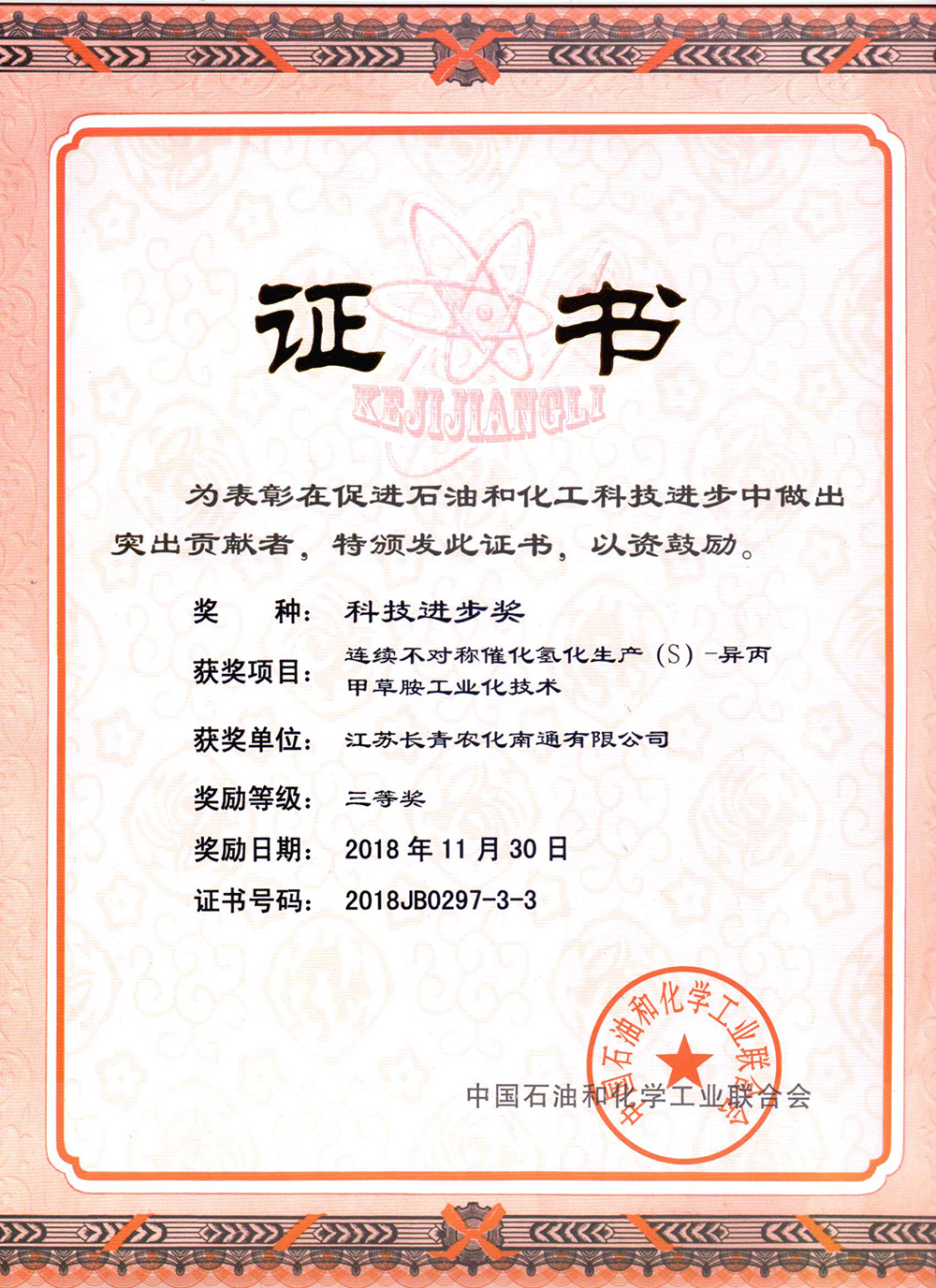2018中国石油和化学工业科学技术奖励--证书--世俱杯(中国)南通