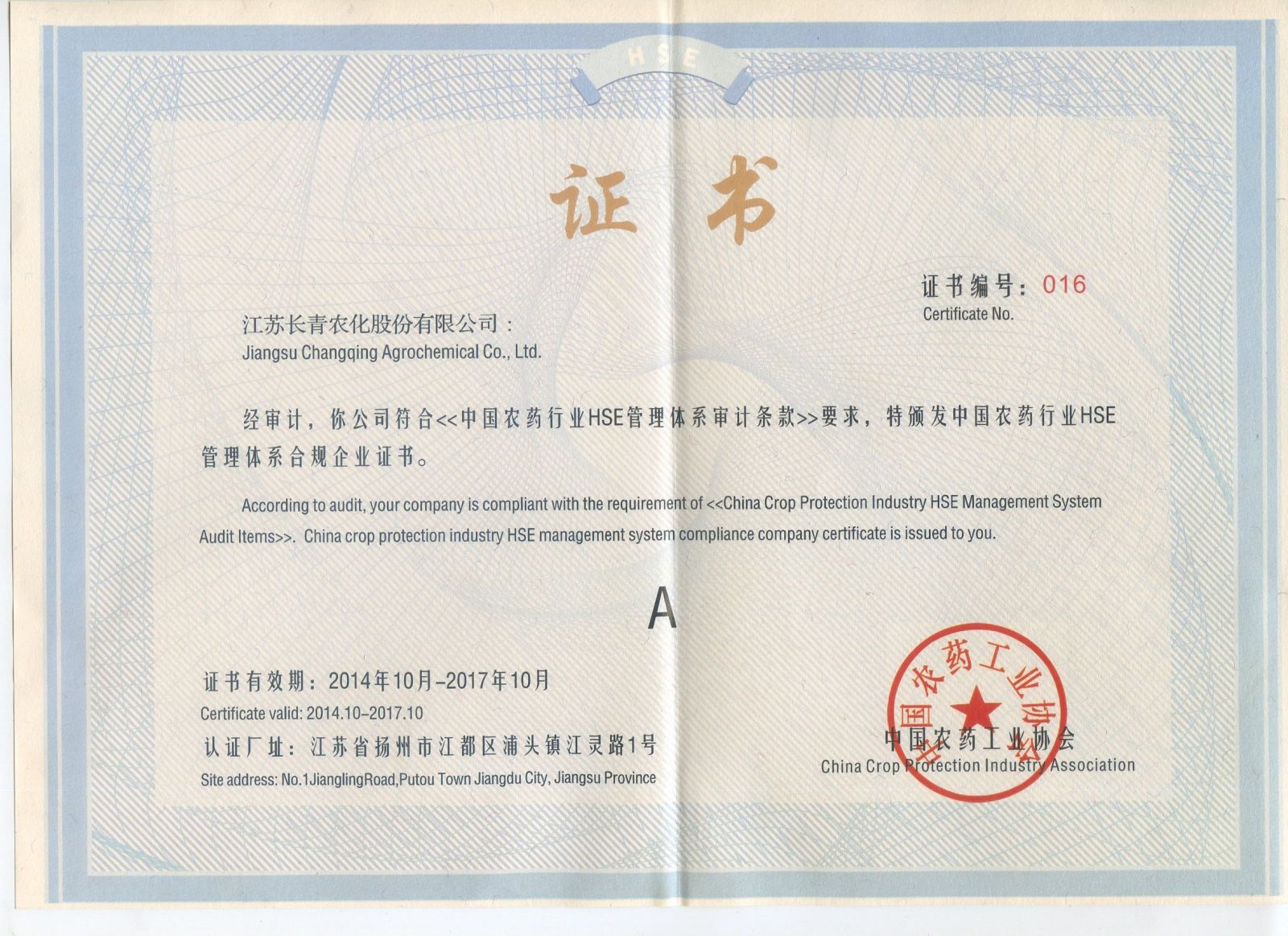 2013年有12家企业顺利通过中国农药行业HSE合规企业认证,今年又有5家企业新加入中国农药行业HSE合规企业的行列,他们是:江苏扬农化工股份有限公司、江苏优士化学有限公司、世俱杯赛官方网站、京博农化科技股份有限公司和江苏艾津农化有限责任公司。